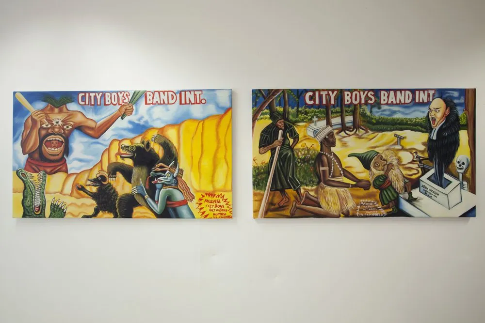 Kumasi, capital of the Asante region and Ghana's second largest city, is known throughout West Africa as a cultural city. Visual communication is an integral part of Ghana's urban landscape and Kumasi is renowned for its thriving scene of street painting workshops, with their masters, assistants and apprentices. It was artists of this kind that achieved international notoriety in the 1989 Pompidou exhibition, Magiciens de la Terre. From the highly informal workplace of the street, the three artists exhibited display a vitality that recalls Basquiat and Haring's downtown New York of the 1980s.