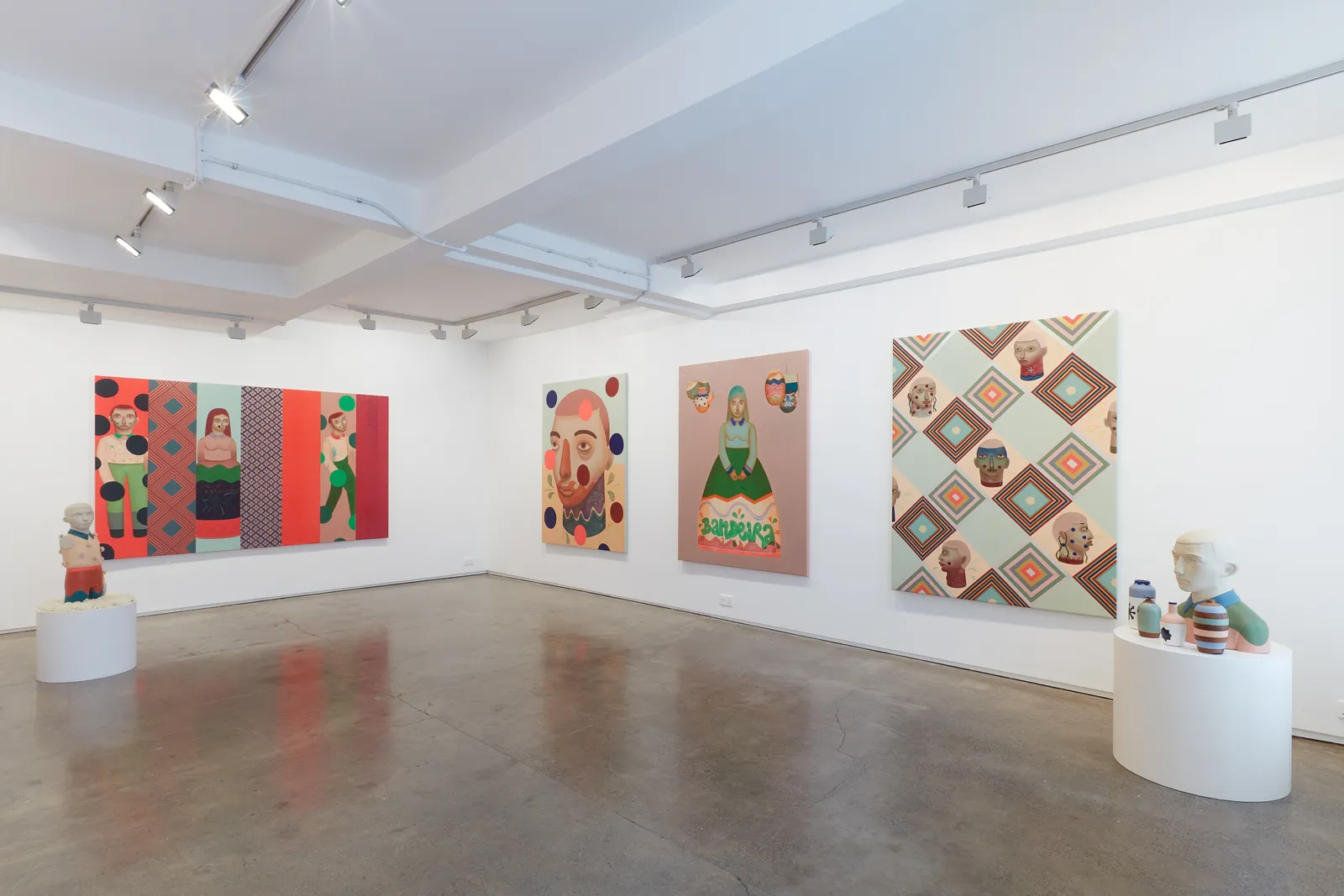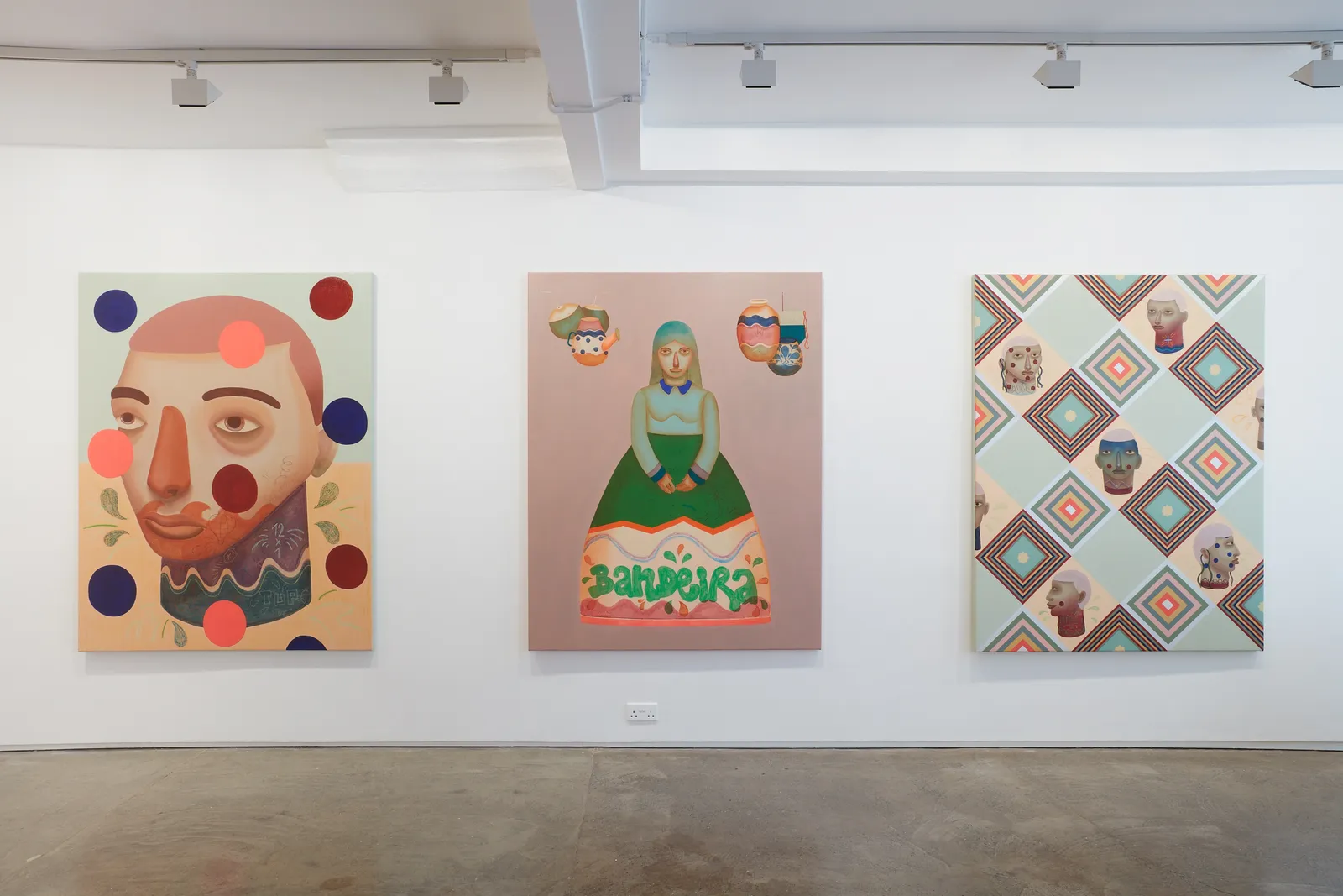 'Cada cabeça uma sentença' exposes several heads painted in different ways to represent 'ex-votos', objects naively made of wood which are given as an offering, as a form of gratitude for some grace achieved. The geometric shapes symbolize segregation through divisions and borders, with some images and inscriptions inserted randomly, referring to Brazilian popular architecture.