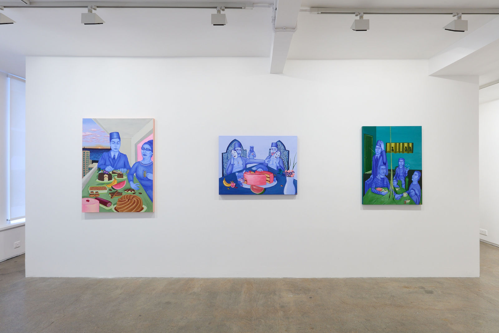 Hayoun’s paintings are an ongoing investigation into enduring systems of control and the redeeming power of culture and community. In this new body of work, Hayoun continues to draw upon the rich legacy of his Egyptian, Tunisian heritage, specifically the stories shared by his elders that speak of exile and loss but also love and resistance. Their portraits populate his canvases, immortalised in tones of blue that shimmer between past and present and positioned in intimate dialogue with icons of Arabic cinema and song or alongside kindred spirits facing upheaval and displacement.