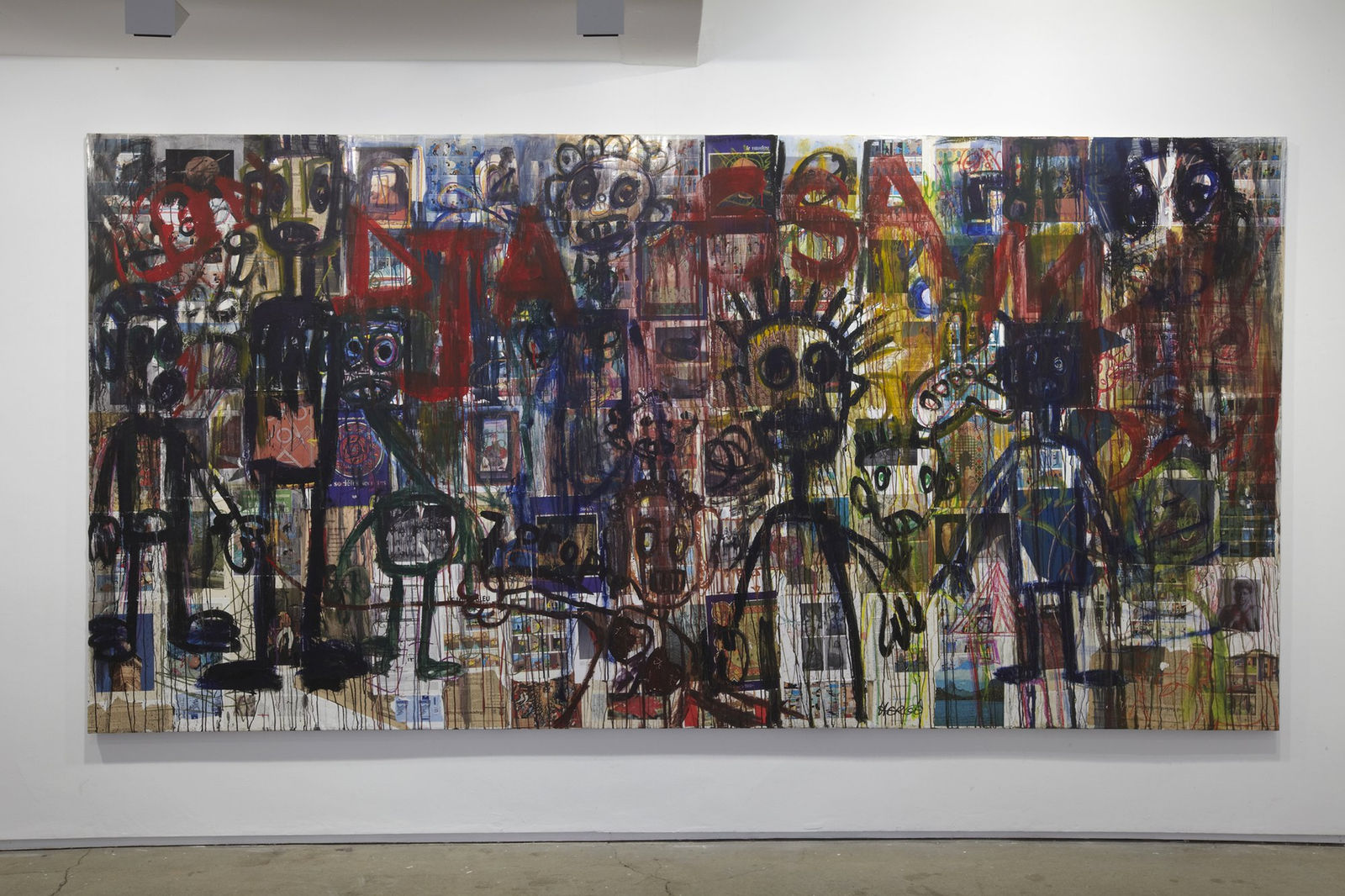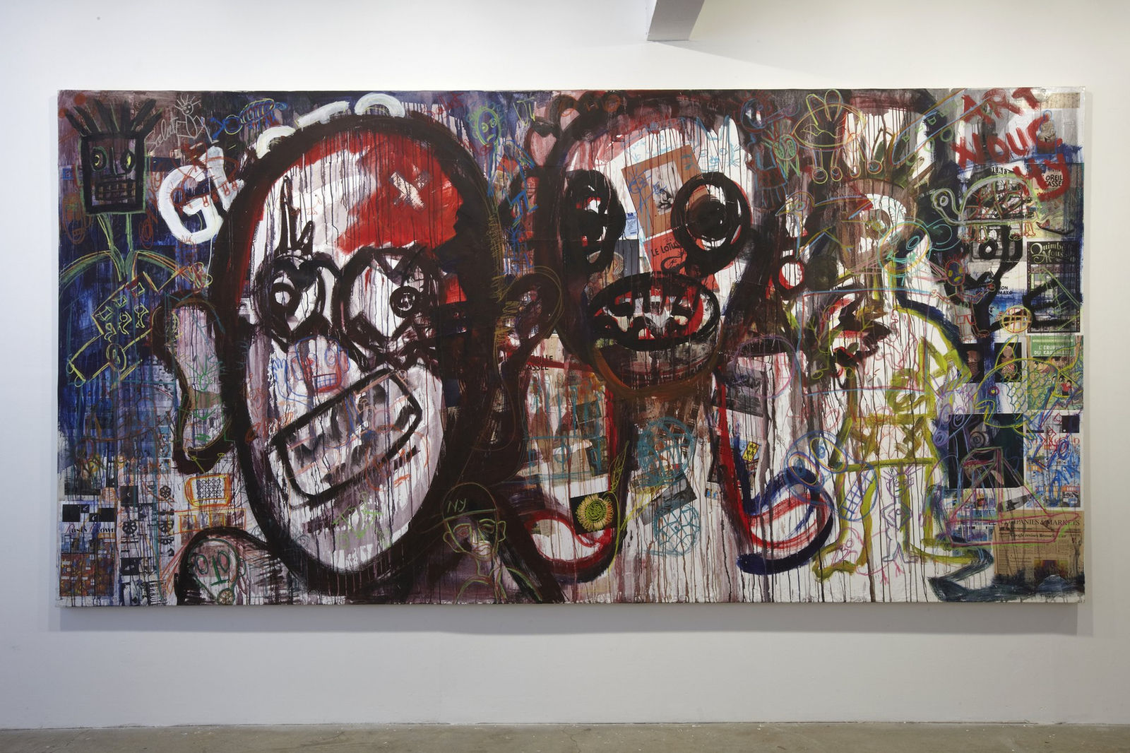 Aboudia is also a master of multi-layered imagery as he mixes with great energy characters from his direct neighbourhood and fragments of found comic strips, advertising and the media. Enigmatic details come in and out of focus, often only revealing themselves after several viewings. His expression of revolt and explosive, incendiary life in his everyday urban environment brings to mind artists from the great American tradition, Twombly perhaps in his casual-looking execution, and Dubuffet. Aboudia's unrestrained use of violent figuration is a welcome reminder of the power of paint to suggest the vitality and chaos of life.