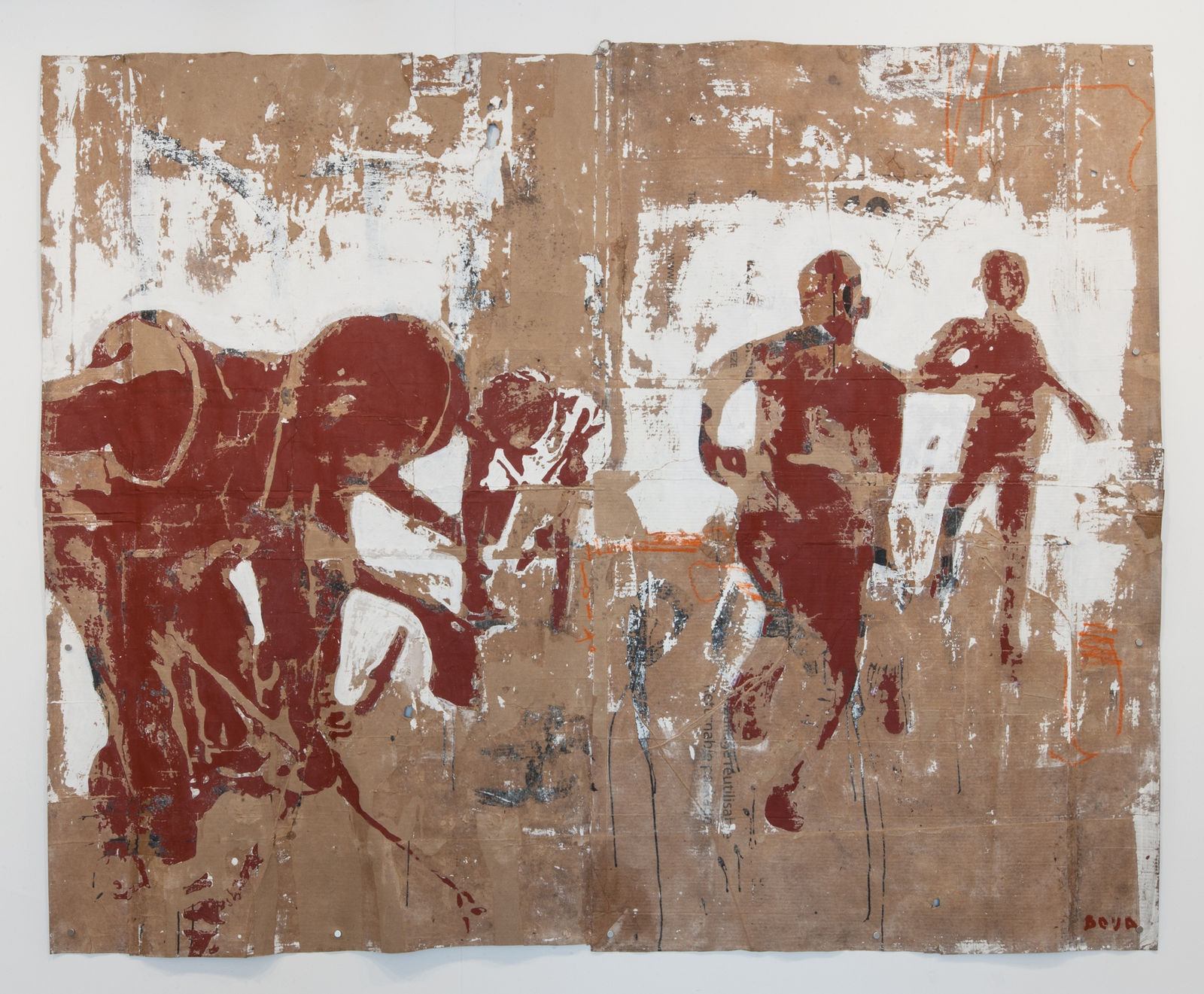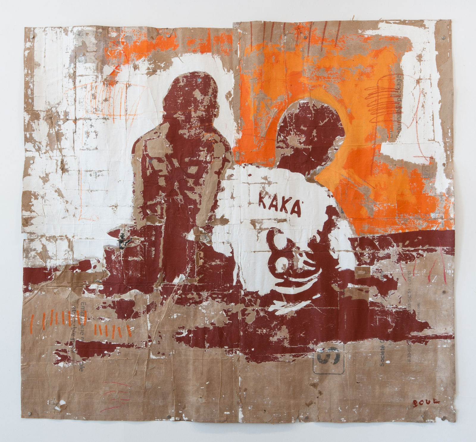 In his second show with the gallery, Boua takes the street kids of his hometown Abidjan as subjects for a powerful series of portraits. ‘I wanted to show their suffering, their way of life’, he says, ‘so that people are finally aware of this painful reality they pretend not to see’. Boua is noted for his textured and layered compositions, using tar and acrylic on found cardboard boxes. Each layer is applied and then scrubbed and stripped back, leaving abstract forms that come in and out of focus. His use of found materials – recycling the cardboard boxes used as makeshift shelters by street kids – shows a strong engagement with his local environment. Boua achieves a careful balance between his heavy gestures and violent execution and the gentle treatment of his subject matter, both mute and subtle.
