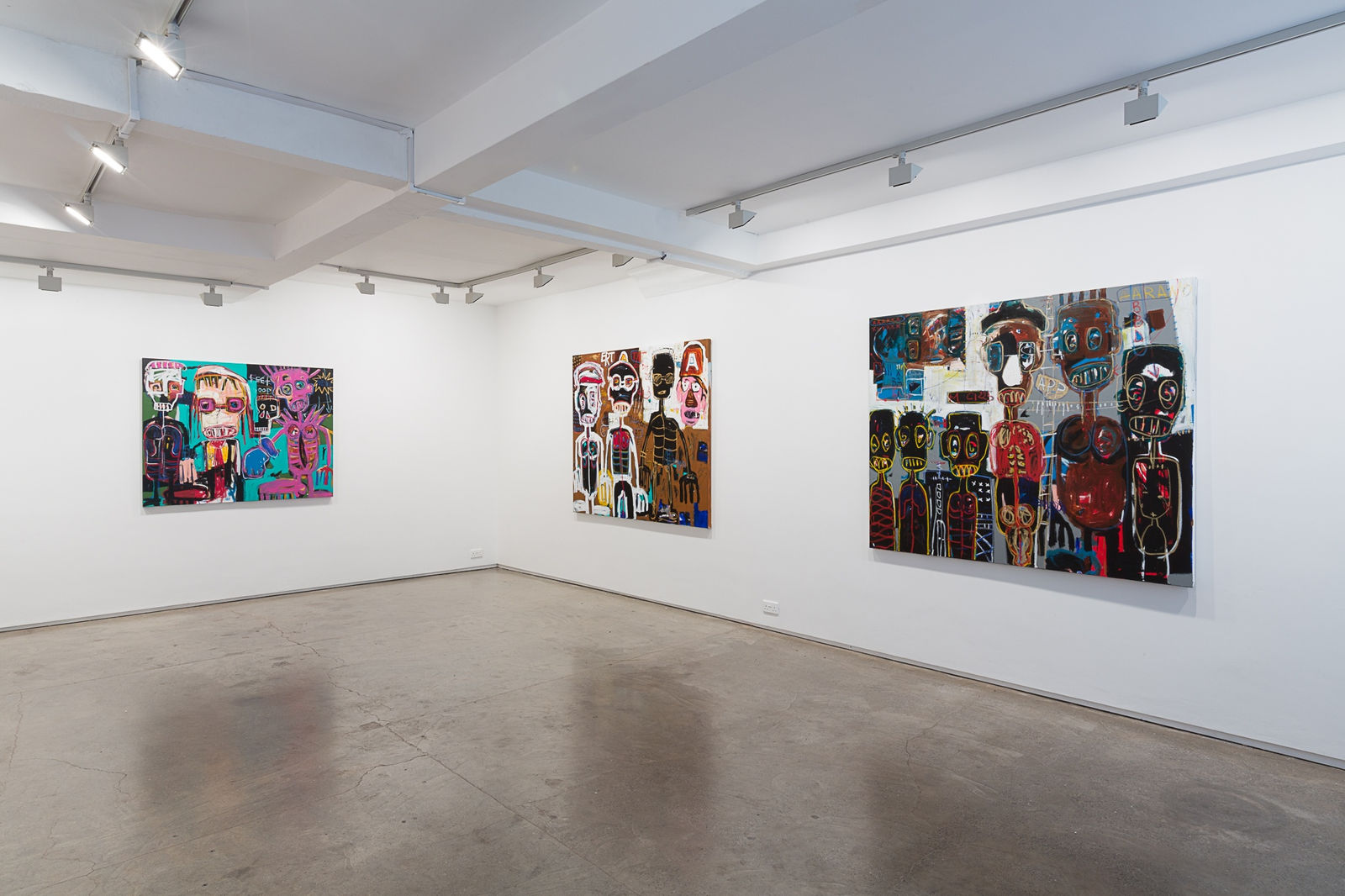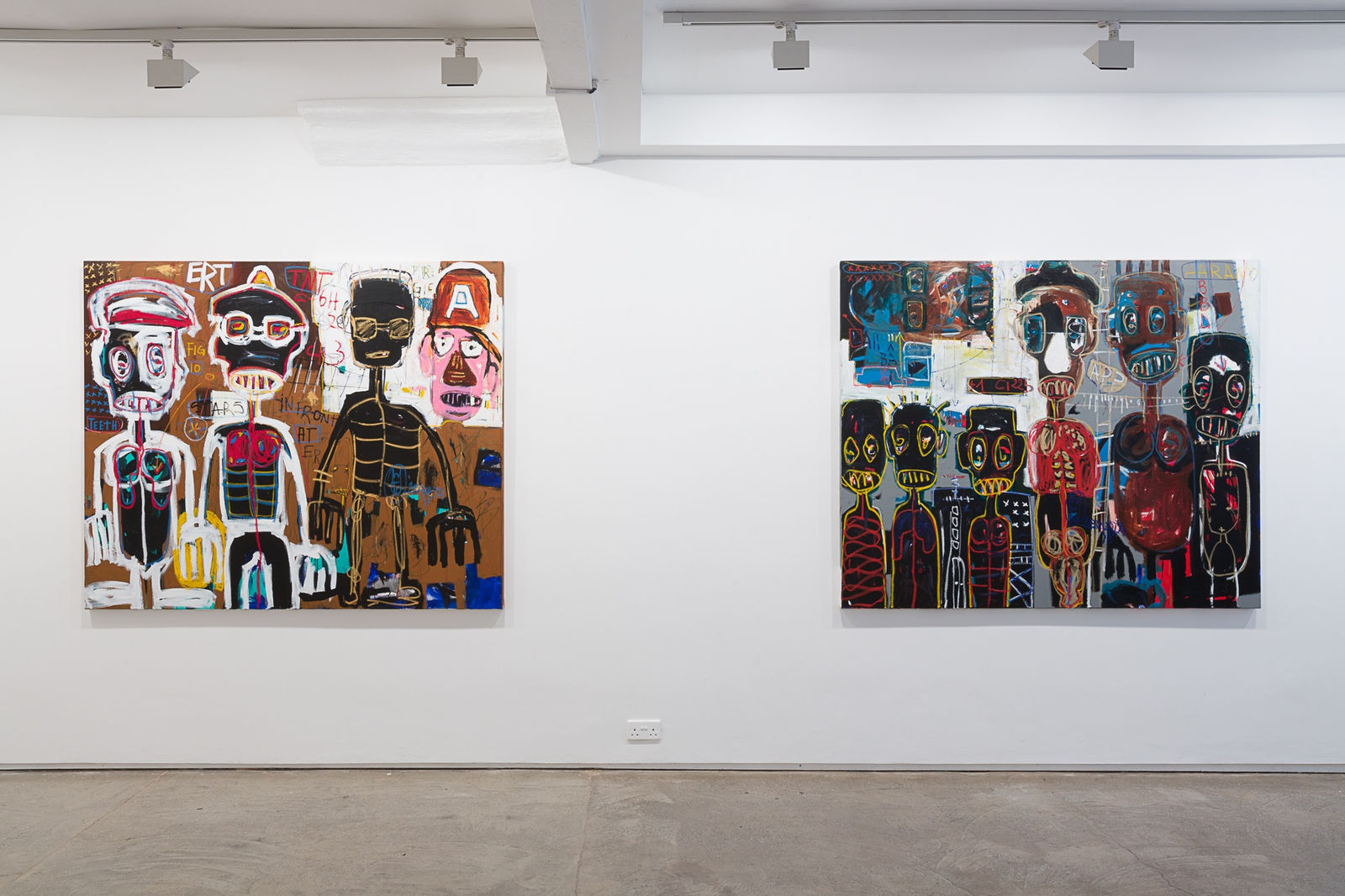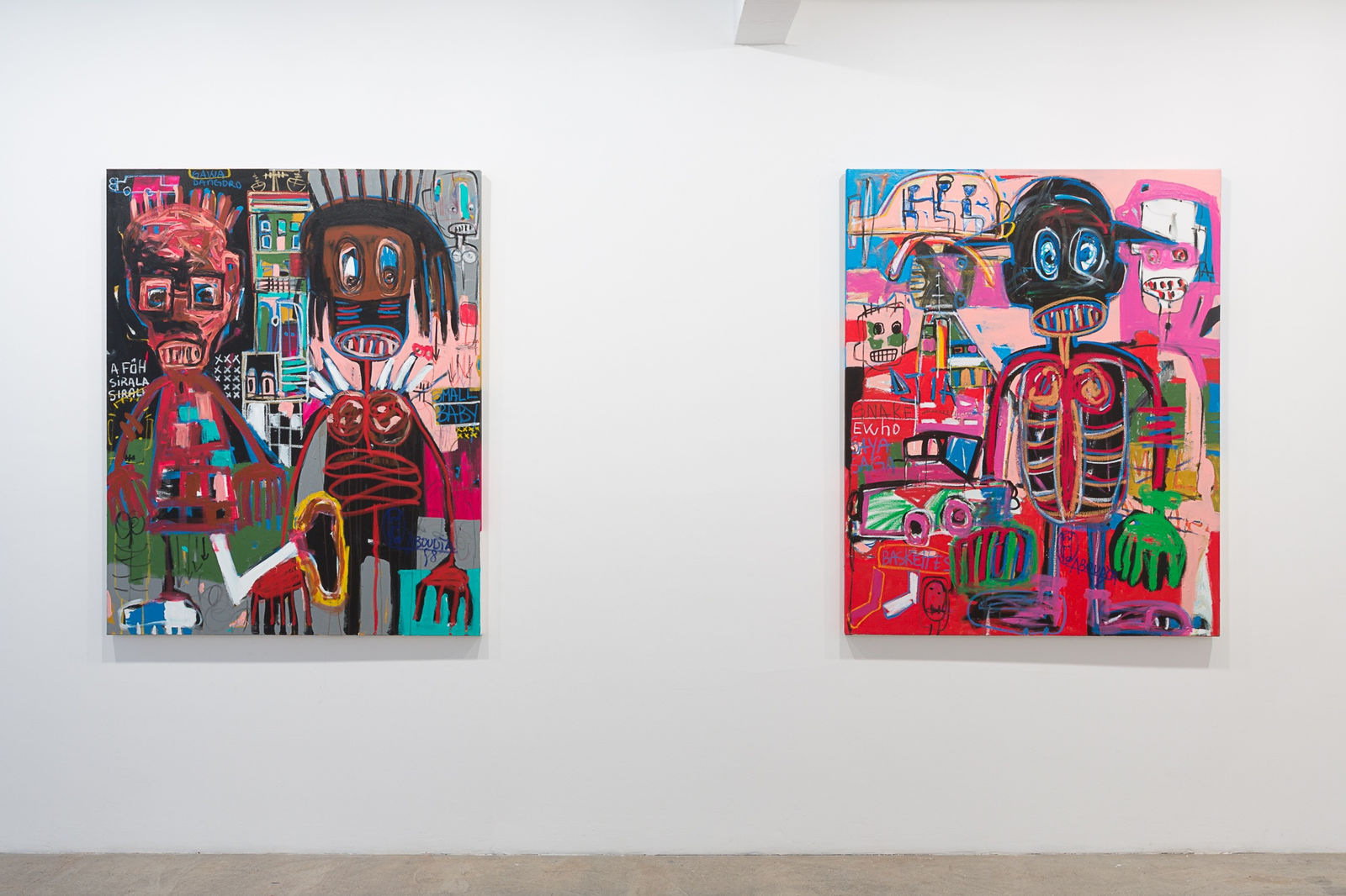 Aboudia is noted for his large-scale, heavily layered, brutally energetic paintings that combine an innocence and spontaneity with the portrayal of a dark interior world. Since the Ivorian civil war in 2011, his urban landscapes have been haunted by trauma; armed soldiers, ominous skulls and a populace hemmed in by danger. This new series continues to grapple with the hardships of life on the streets and the social inequalities of downtown Abidjan. Often claustrophobic and oppressive, his painting achieves a careful balance between pathos and aggression. While the vitality of his style recalls Basquiat, the darker undercurrents and themes describe a battlefield straight out of Goya.