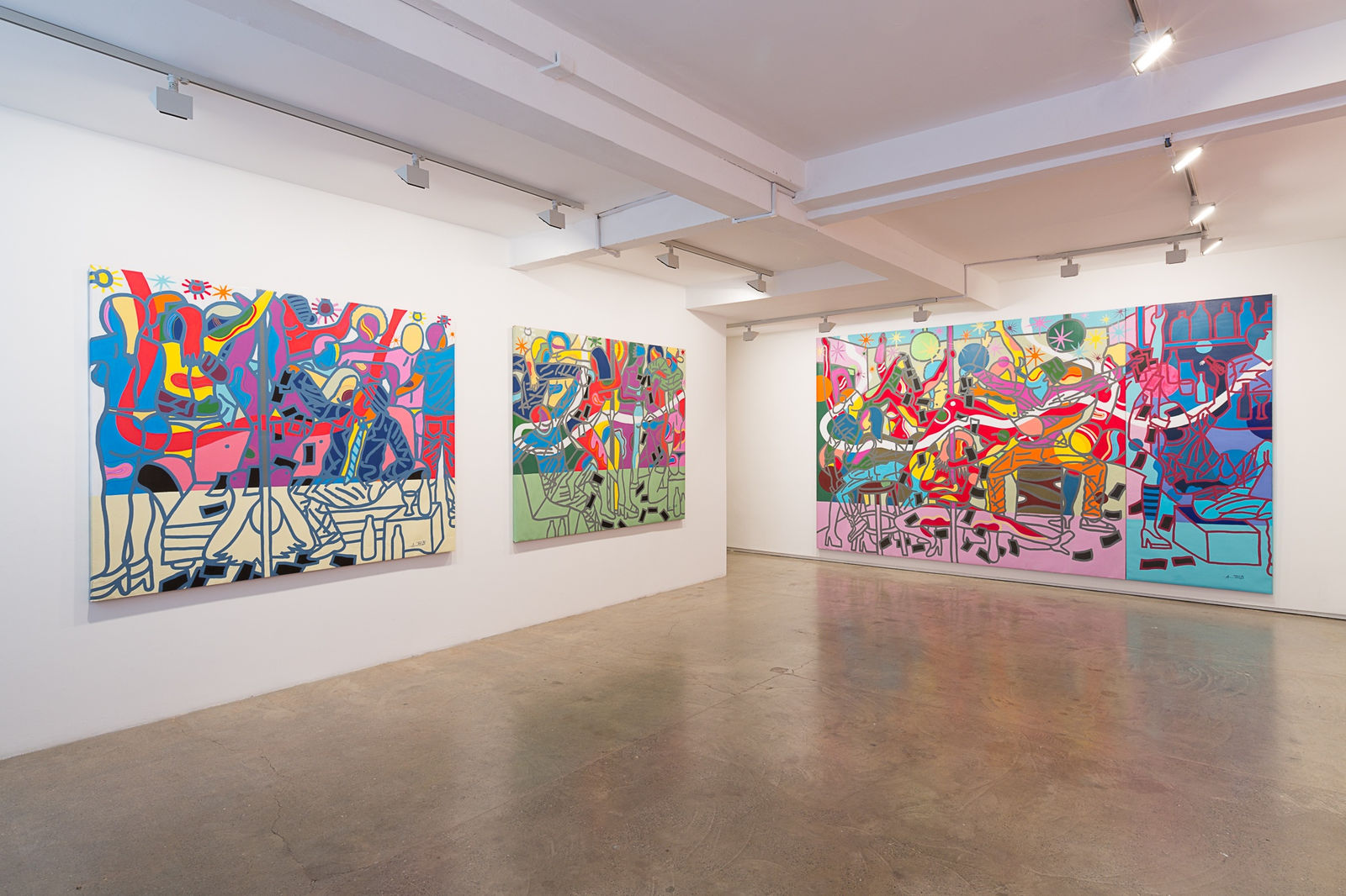 Jack Bell Gallery is pleased to present a new body of paintings by contemporary artist Ajarb Bernard Ategwa. In his third solo exhibition with the gallery, Ategwa continues to deal with street life in downtown Douala, Cameroon. This new series, entitled ‘Kwasa Kwasa Girls’, focuses on the hive of activity after dark and takes its name from one of the city’s established strip clubs.