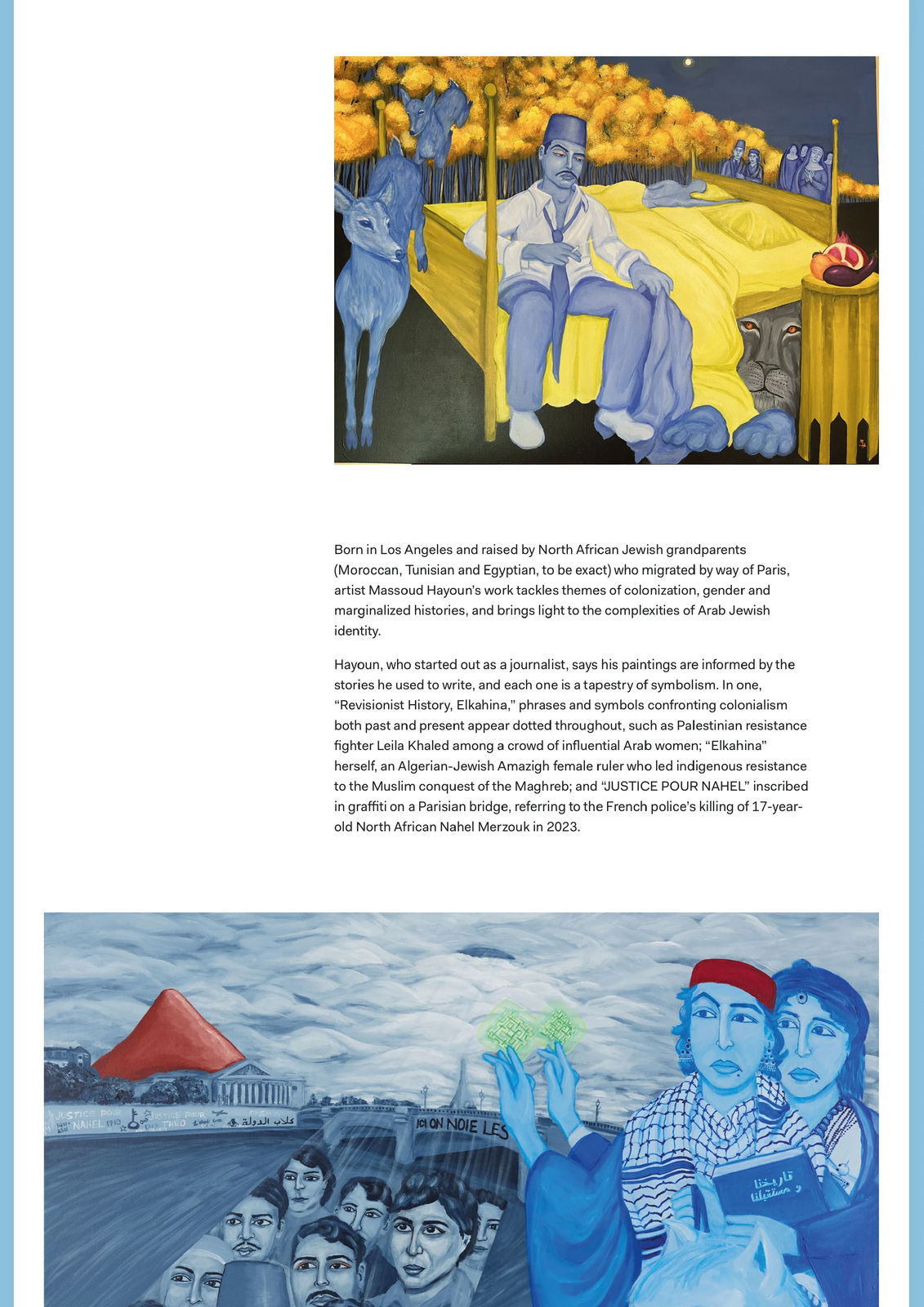 Hayoun, who started out as a journalist, says his paintings are informed by the stories he used to write, and each one is a tapestry of symbolism. In one, “Revisionist History, Elkahina,” phrases and symbols confronting colonialism both past and present appear dotted throughout, such as Palestinian resistance fighter Leila Khaled among a crowd of influential Arab women; “Elkahina” herself, an Algerian-Jewish Amazigh female ruler who led indigenous resistance to the Muslim conquest of the Maghreb; and “JUSTICE POUR NAHEL” inscribed in graffiti on a Parisian bridge, referring to the French police’s killing of 17-year-old North African Nahel Merzouk in 2023.