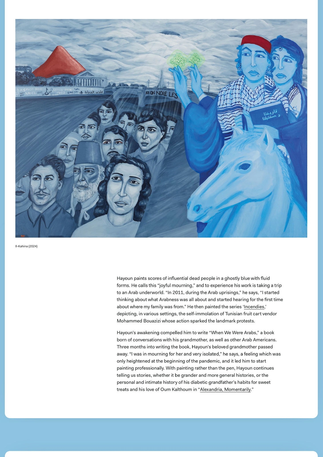 Hayoun paints scores of influential dead people in a ghostly blue with fluid forms. He calls this “joyful mourning,” and to experience his work is taking a trip to an Arab underworld. “In 2011, during the Arab uprisings,” he says, “I started thinking about what Arabness was all about and started hearing for the first time about where my family was from.” He then painted the series ‘Incendies,’ depicting, in various settings, the self-immolation of Tunisian fruit cart vendor Mohammed Bouazizi whose action sparked the landmark protests.