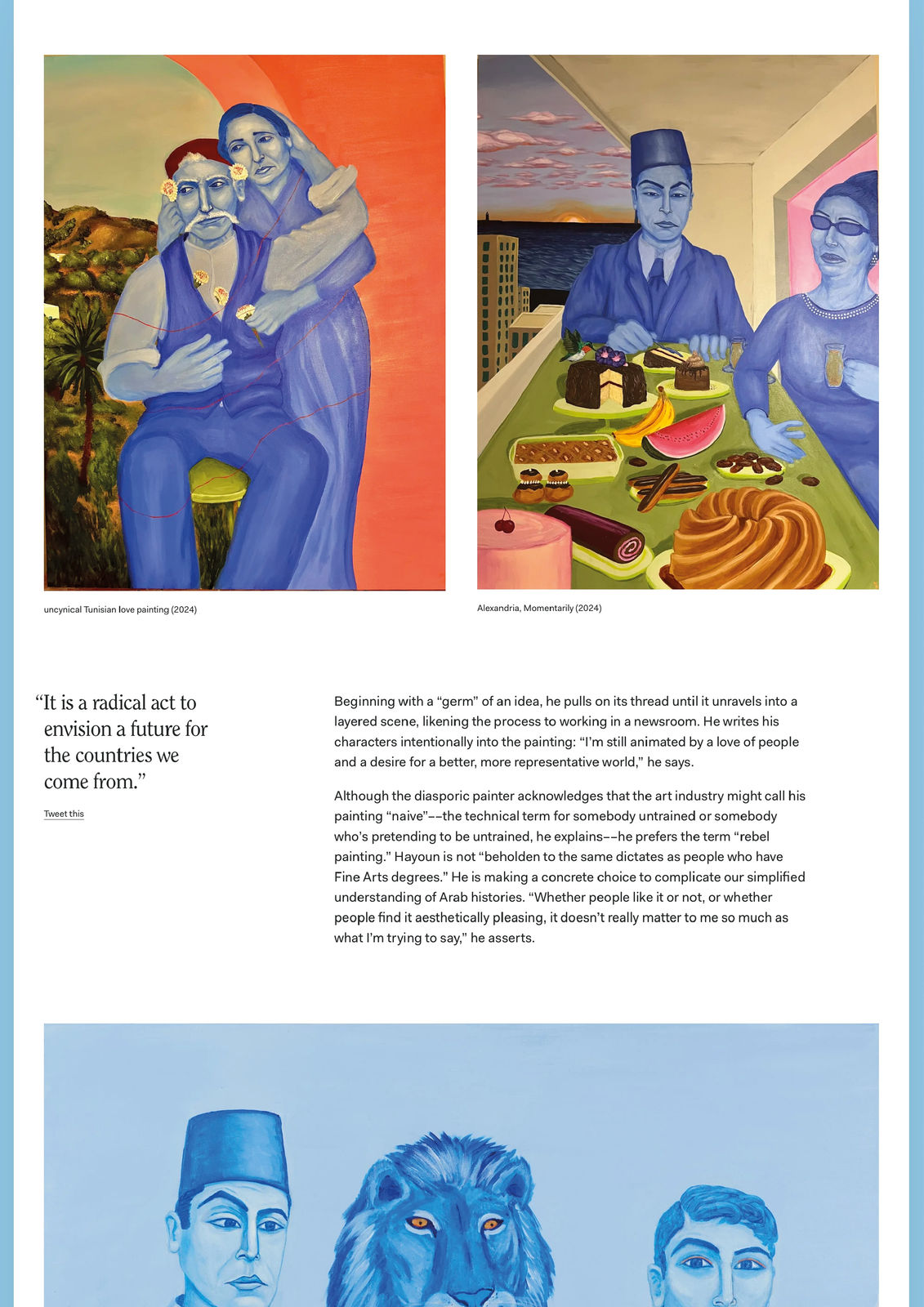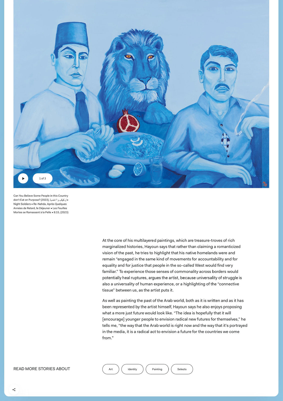Although the diasporic painter acknowledges that the art industry might call his painting “naive”––the technical term for somebody untrained or somebody who’s pretending to be untrained, he explains––he prefers the term “rebel painting.” Hayoun is not “beholden to the same dictates as people who have Fine Arts degrees.” He is making a concrete choice to complicate our simplified understanding of Arab histories. “Whether people like it or not, or whether people find it aesthetically pleasing, it doesn’t really matter to me so much as what I’m trying to say,” he asserts.